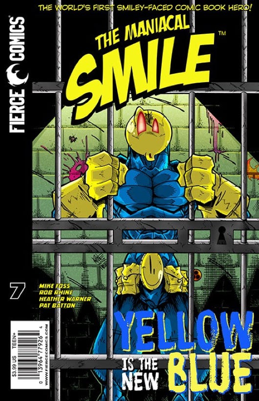 The Maniacal Smile stumbles upon a plot that threatens Utopia and is enlisted by the mayor to go deep undercover - in prison! Aided by a mysterious inside source known only as McGregor, he works to obtain critical information on a key suspect. However, in true Smiley fashion, unbridled calamity sets in. Prison break or bust, this is Yellow is the New Blue.